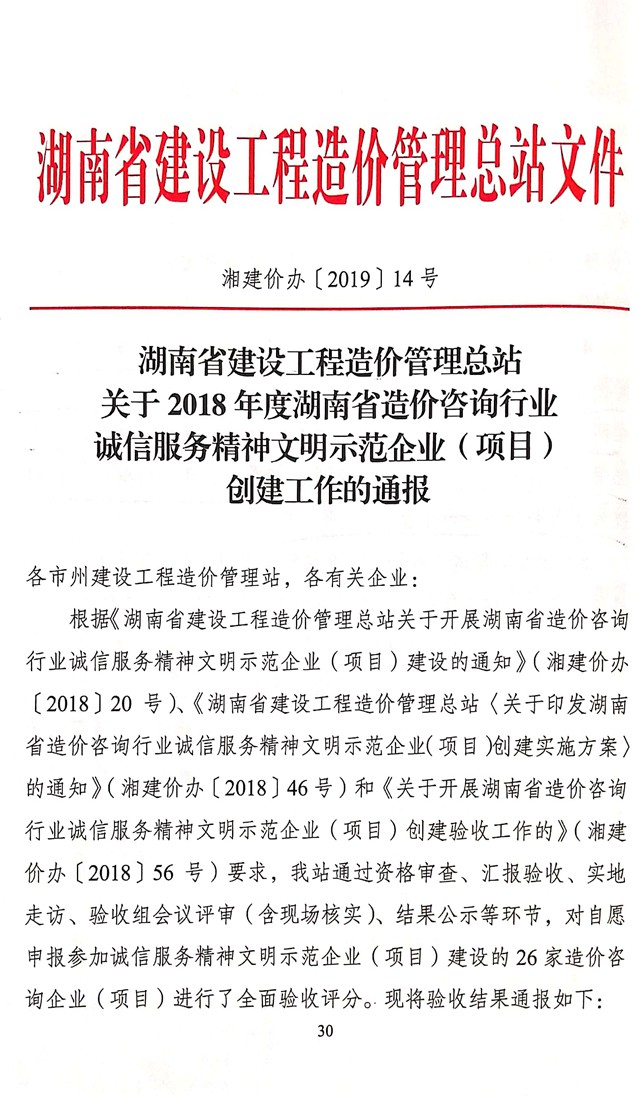 湖南省建設(shè)工程造價(jià)管理總站 關(guān)于2018年度湖南省造價(jià)咨詢行業(yè) 誠信服務(wù)精神文明示范企業(yè)(項(xiàng)目) 創(chuàng)建工作的通報(bào)